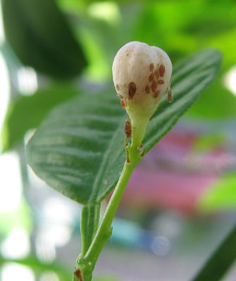 Die wohl bekanntesten Schädlinge sind Blattläuse. Sie befallen an Citruspflanzen häufig die jungen, zarten Triebe. Durch ihre saugende Aktivität sorgen sie für verkrüppeltes Wachstum der Blätter, die sich nach unten einwärts rollen und zumeist vorzeitig absterben. Die meist schwarzen kleinen Insekten sind wie schwarze Flecken zumeist rund um die Knospe und Sproßachse ansäßig. Einige Arten sind gelblich grün, grün, oder braun gefärbt, aber die Schäden sind zur schwarzen Blattlaus identlisch. Oft zieht ein Befall auch Ameisen nach, die Honigtau, die Ausscheidungen der Blattläuse, als Nahrung aufnehmen. Blattläuse gelten als Überträger für eine Vielzahl von Viren, die gerade in Citrusanbauländern zu massiven Baumverlusten durch diese Viren geführt haben. Ihre klebrigen Ausscheidungen sind idealer Nährboden für Pilz, wie Rußtau, der bei großem Befall ganze Blätter überziehen kann. Durch ihr zahlreiches Auftreen haben Blattläuse eine Vielzahl natürlicher Feinde, wie Marienkäfer, Florfliegen und zum Teil auch Vögel. Diese halten die Läuse in Populationsgrenzen, doch oft ist der Befall für eine zierende Citruspflanze zu hoch. Hier müssen künstlich Nützlinge ausgebracht werden, oder aber es wird mit einer Seifenlösung gesprüht, der etwas Essig und Zitronensaft zugesetzt wurde. Dies macht zumeist den 'Saugern' den Garaus. Der Fachhandel hat fertige Lösungen vorrätig, ebenso wie eine Unmenge an chemischen 'Kampfstoffen'.