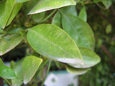 | Typisches Schadbild durch Spinnmilben an einer Mandarine | Typische Gespinnste an der Blattachsel einer Zitrone |