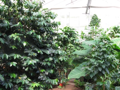 Hier ein Blick über die kleine Teeplantage im Gewächshaus. |